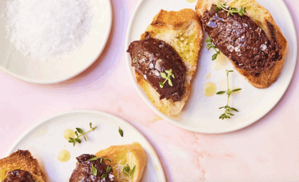 - Antes de servir, poner sobre cada tostada una “quenelle” de chocolate hecha con dos cucharas soperas. Y finalmente añadir unas gotas de nuestro AOVE VERDE CALAS sobre cada quenelle y espolvorear con cuidado con las escamas de sal.